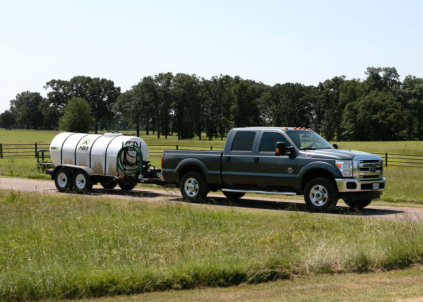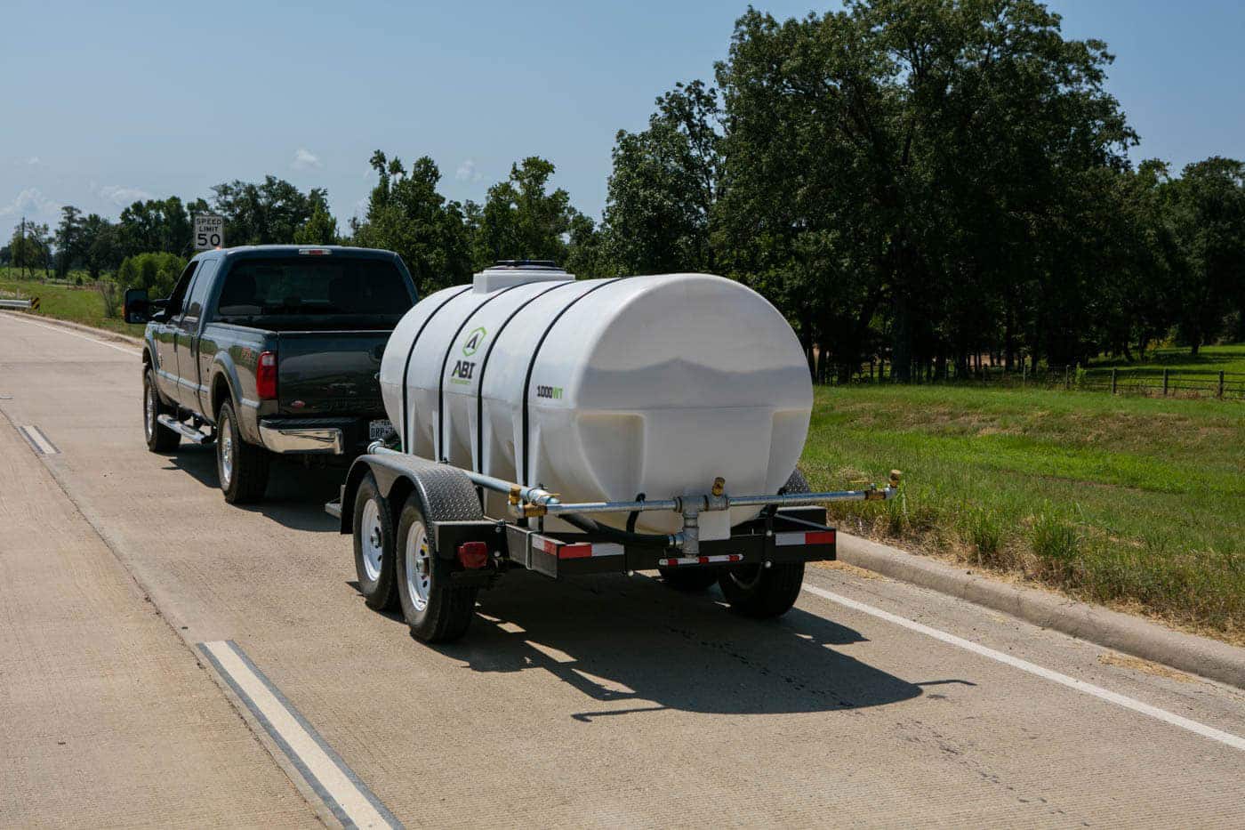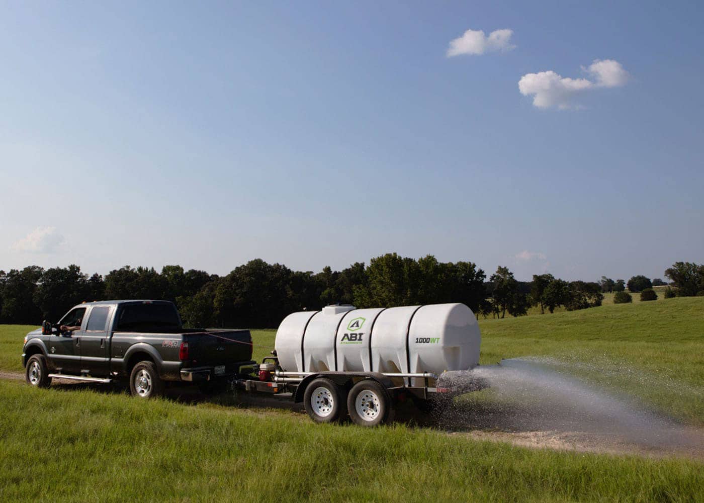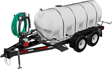The 1000 gallon DOT ABI Water Trailer hauls and applies large volumes of water around the farm, property, job site, or nearly anywhere your truck can take you. This commercial-grade trailer, built on a custom proprietary frame, can be towed by a large tractor or truck and is fully DOT compliant for use on public roadways. It is powered by an engine and pump to apply variable amounts of water from either the rear spray nozzles (wide spray) or the available spray hose (spot application). Additionally, it has the ability to turn the flow of water on and off, on-the-fly, from the seat of the tow vehicle.