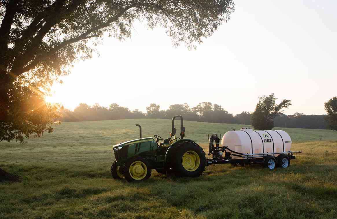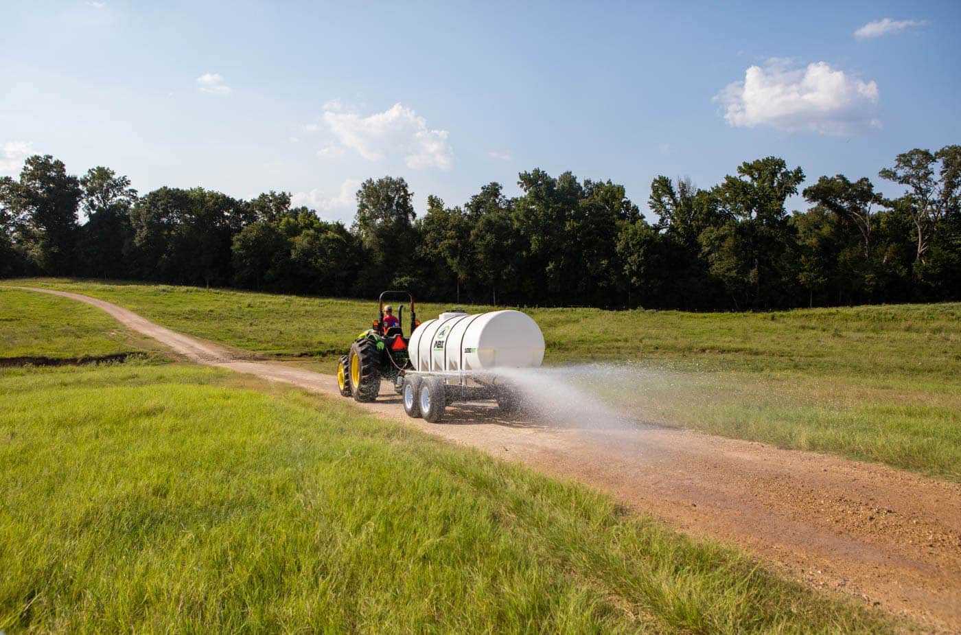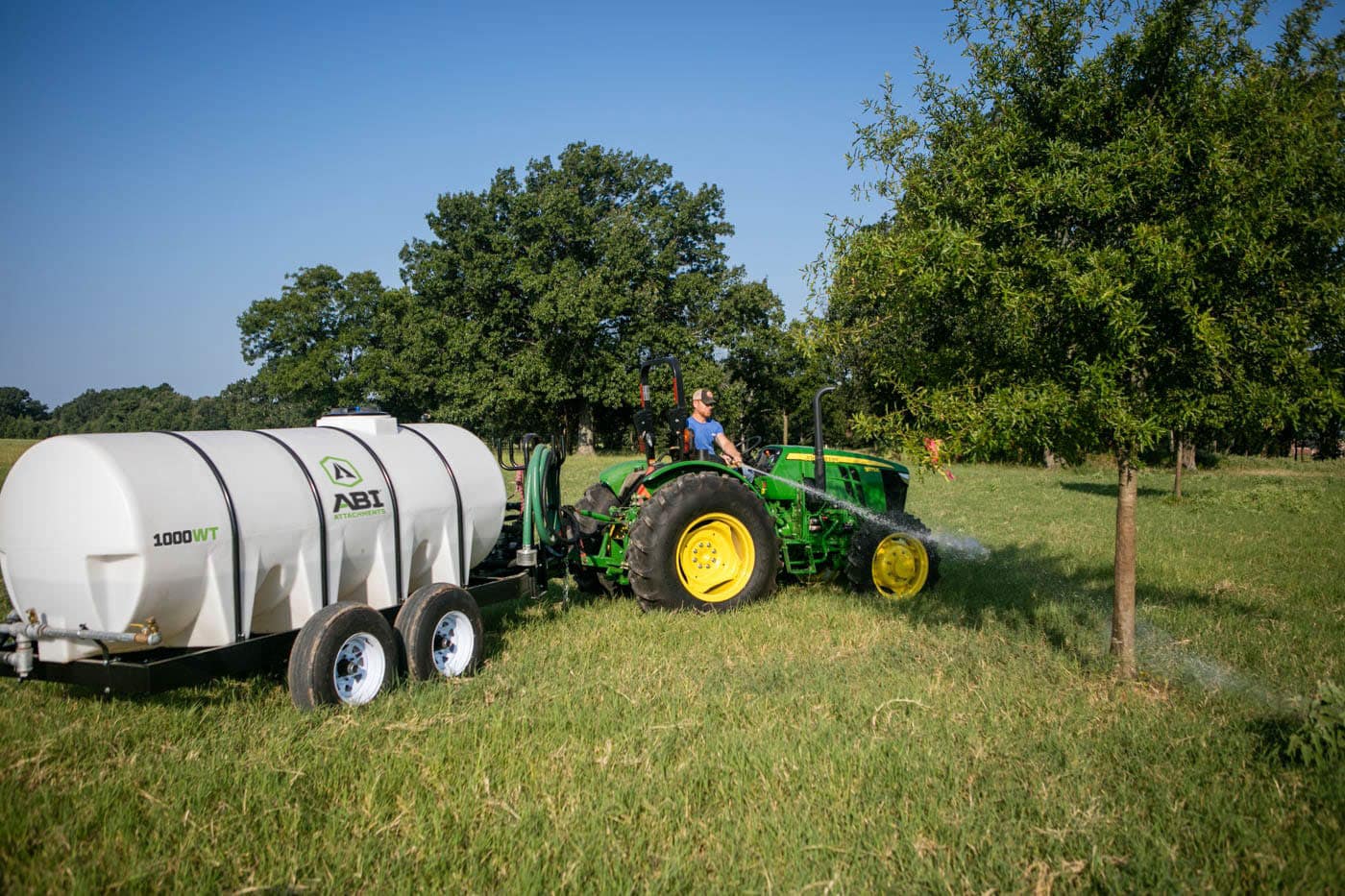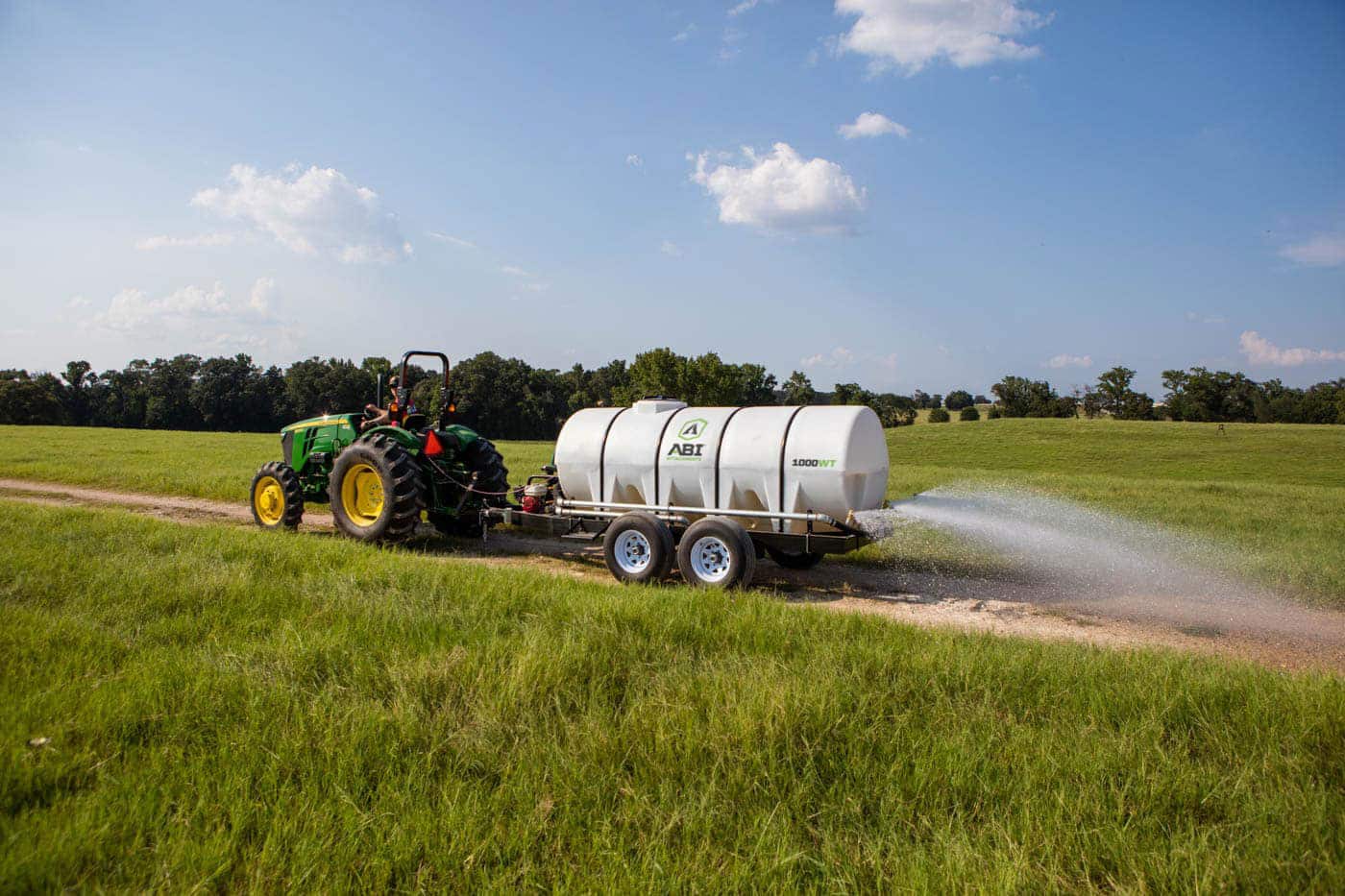 The 1000 gallon dual axle ABI Water Trailer hauls and applies large volumes of water around the farm or property. This commercial-grade trailer, built on a custom proprietary frame, can be towed by a large tractor, truck, or SUV. It is powered by an engine and pump to apply variable amounts of water from either the rear spray nozzles (wide spray) or the available spray hose (spot application). Additionally, it has the ability to turn the flow of water on and off, on-the-fly, from the seat of the tow vehicle.